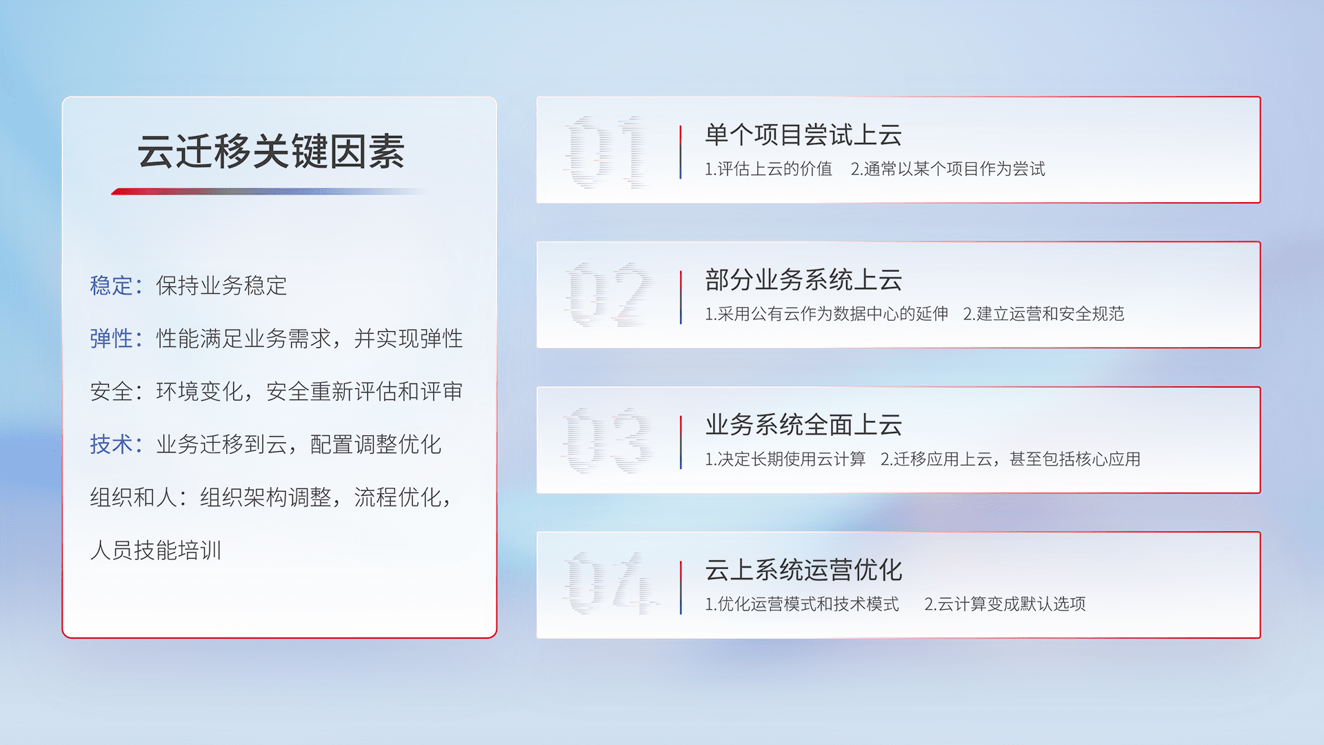结合实际业务,,,从规划设计、、、云平台选型、、、、云原生改造、、数据迁移、、、、集成交付,,,迁移全过程为客户识别最佳上云路径,,,做好风险识别管理,,,设计网络架构、、身份权限、、安全审计合规、、操作审计、、、、日志审计、、、监控告警策略、、多站点容灾设计等,,,对云上基础设施进行整体规划,,,,提升IT治理水平,,,,以满足弹性、、、、高可用、、、高性能的需求。。。