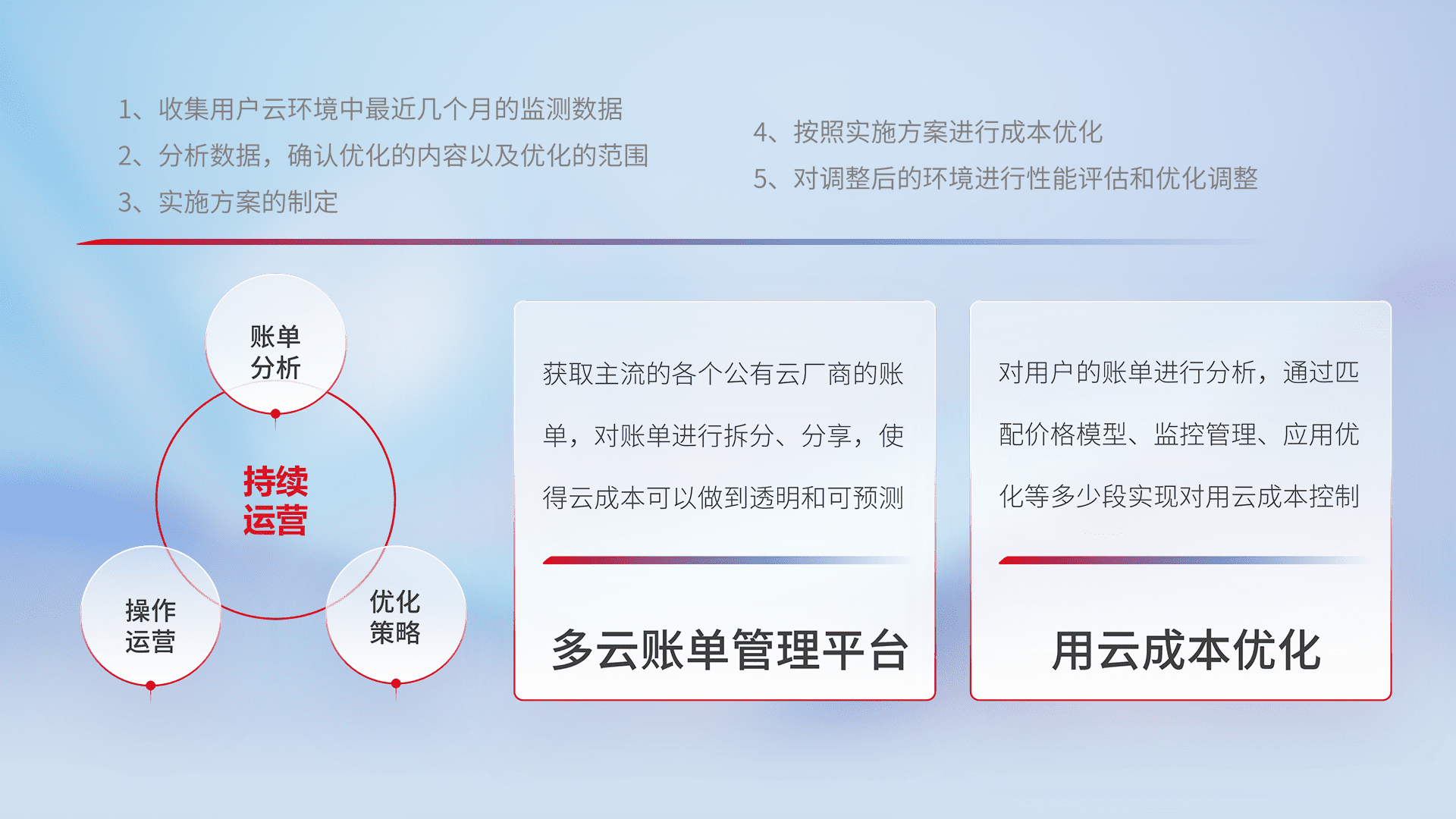 通过多云纳管,,,以统一的资源数据模型把客户的云资源进行抽象和封装,,,,进而实现对多云资源的统一操作,,,,保障云资源管理的可靠性、、、稳定性与可用性。。。。量身定制化运维内容,,,配置、、开发运维、、、补丁管理、、、备份、、、监控、、、认证和访问管理、、审计和日常巡检等,,,保障在用云过程中的可靠度,,,,稳定度以及高可用率。。。